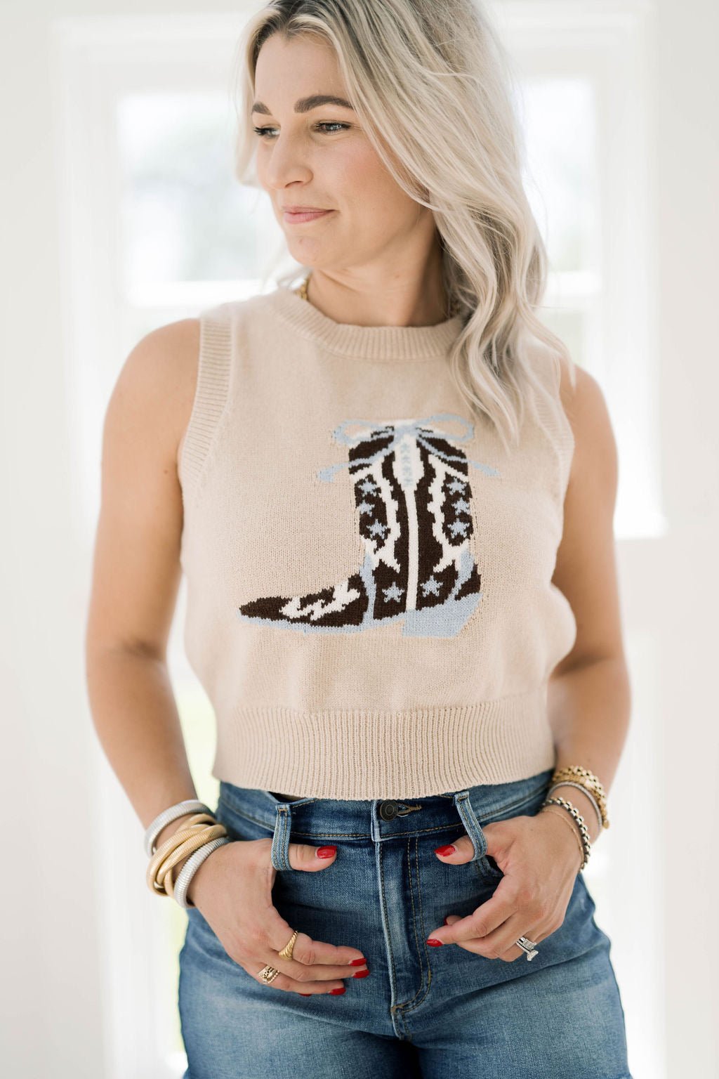 Elevate your western style with the Lets Ride Top. This graphic crew neck vest combines the classic look of western boots with the cozy comfort of a sweater. Perfect for any occasion, it's sure to add a touch of enthusiasm and passion to your outfit!